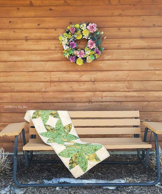 I used four of the fabrics given to me by Island Batik as part of their ambassador program; Eucalyptus (the fabric with a a little yellow mixed in), Ivy, Branches in Light Smore from the Mountain's Majesty line, and the flange is Bubbles in Raspberry.